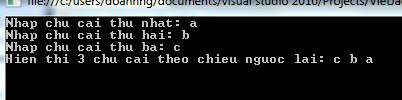 Dưới đây là chương trình C# để giải bài tập nhập 3 chữ cái và hiển thị theo chiều ngược lại trong C#: