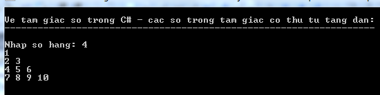Console.Write("Ve tam giac so trong C# - cac so trong tam giac co thu tu tang dan:\n");