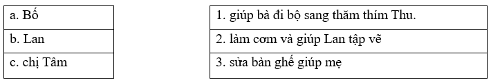 Ở nhà Lan, bố sửa chữa bàn ghế cho mẹ. Mẹ đi chợ để chị Tâm làm cơm. Chị Tâm vừa làm cơm vừa giúp bé Lan tập vẽ. Bé Lan nghỉ vẽ thì giúp bà đi bộ qua thăm thím Thu.