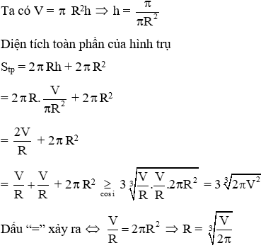 Câu 4: Một hình trụ có thể tích V không đổi. Hỏi bán kính đáy bằng bao nhiêu để diện tích toàn phần của hình trụ đó là nhỏ nhất?