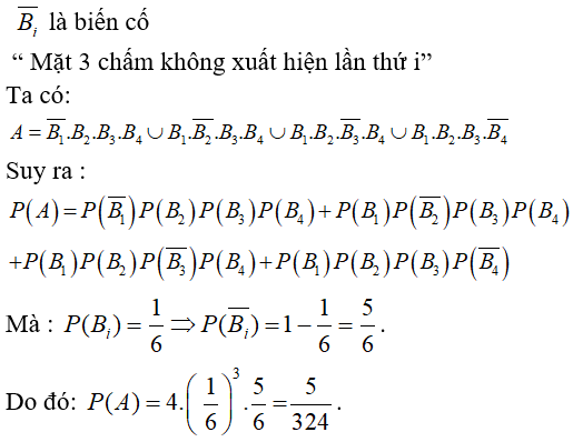Gọi Bi là biến cố “ mặt 3 chấm xuất hiện lần thứ i” với i = 1; 2; 3; 4