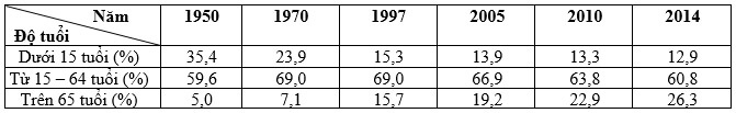 Câu 15: Cho bảng số liệu: Cơ cấu dân số theo độ tuổi của Nhật Bản qua các năm: