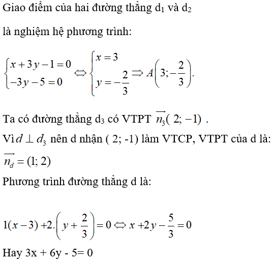 Câu 7: 7. Lập phương trình của đường thẳng Δ đi qua giao điểm của hai đường thẳng d1: x + 3y – 1 = 0 ; d2: x – 3y - 5 = 0 và vuông góc với đường thẳng d3: 2x - y + 7 = 0.