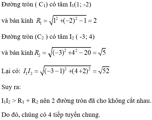 Câu 14: Số tiếp tuyến chung của hai đường tròn (C1): 2+y2-2x+4y+1=0 và (C2): 2+y2+6x-8y+20=0 là: