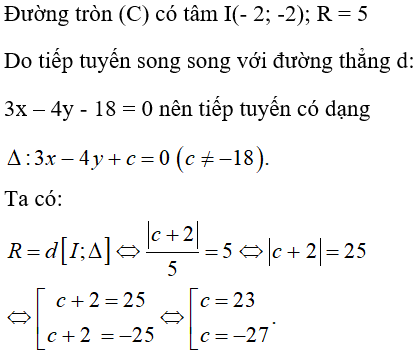 Câu 19: Viết phương trình tiếp tuyến của đường tròn (C): x2 +y2 + 4x + 4y – 17 =0 , biết tiếp tuyến song song với đường thẳng d: 3x – 4y - 18 = 0 .