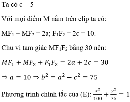 Câu 18: Cho elip (E) có các tiêu điểm F1(-5;0),F2(5;0) và một điểm M nằm trên (E) sao cho chu vi của tam giác MF1F2 bằng 30. Khi đó phương trình chính tắc của elip là:
