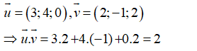 Câu 41: Trong không gian Oxyz, cho hai vectơ u→ = (3; 4; 0), v→ = (2; -1; 2) . Tích vô hướng của hai vectơ u→ và v→ là: