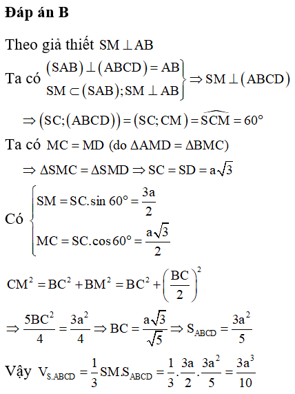 Câu 16: Cho hình chóp S.ABCD có đáy là hình vuông, gọi M là trung điểm của AB. Tam giác SAB cân tại S và nằm trong mặt phẳng vuông góc với đáy. Biết SD = a√3, SC tạo với mặt phẳng đáy (ABCD) một góc 60°. Thể tích khối chóp S.ABCD theo a là