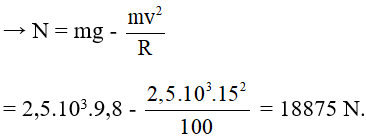 Câu 15: Một ôtô khối lượng 2,5 tấn chuyển động qua một cầu vượt với tốc độ không đổi 54 km/h. Cầu vượt có dạng một cung tròn, bán kính 100 m. Tính áp lực của ôtô của ô tô lên cầu tại điểm cao nhất của quả cầu. Lấy g = 9,8 m/s2.