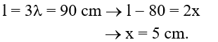 - Khoảng cách xa nhất giữa hai phần tử dây dao động cùng biên độ 5 mm ở hai bó sóng ngoài cùng (cùng cách đầu cố định một đoạn x) là 80 cm lớn hơn 65 cm là khoảng cách xa nhất giữa hai phần tử dây dao động cùng pha cùng biên độ 5 mm. Mà các phần tử ở 2 bó sóng liền kề dao động ngược pha nhau, hai phần tử dao động cùng biên độ 5 mm ở 2 bó sóng liền kề xa nhất là: λ/2