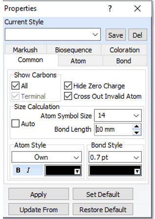 Chú ý: Để điều chỉnh độ dài liên kết chọn nút select/move ; ; giữ chuột trái và di chuyển lên toàn bộ công thức, khi thả chuột trái, phân tử đã được chọn (xuất hiện các dấu chấm xung quanh công thức); nháy chuột phải lên công thức, chọn Object Properties bằng chuột trái, xuất hiện của sổ Properties. Tại mục size Calculation bỏ chọn auto ta sẽ chọn được cơ chữ (Atom Symbol Size) và độ dài liên kết (Bond Length) tùy ý.