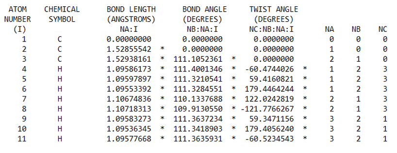 Độ dài liên kết và góc liên kết của C3H8 còn được hiển thị trong file C3H8.out