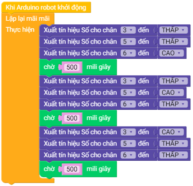 Bài 2 trang 51 Chuyên đề Tin học 10: Em hãy viết một chương trình điều khiển ba đèn LED (được nối lần lượt vào các chân 3,5,6) như Hình 10, hoạt động như sau: