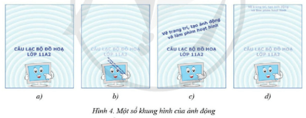 Hoạt động 1 trang 48 Chuyên đề Tin học 11: Hình 4 minh hoạ một số khung hình của một ảnh động với hai văn bản có hiệu ứng khác nhau. Văn bản “CÂU LẠC BỘ ĐỒ HOẠ LỚP 11A2” có hiệu ứng nhấp nháy (ẩn, hiện). Văn bản thứ hai chạy từ vị trí màn hình máy tính lên trên đồng thời phóng to và quay 360”, sau đó thu nhỏ lại, chạy lên trên rồi biến mất. Hãy tạo ảnh động này hoặc ảnh động khác với các hiệu ứng tự điều khiển theo ý thích. Lưu ảnh các khung hình và xuất ảnh động GIF.