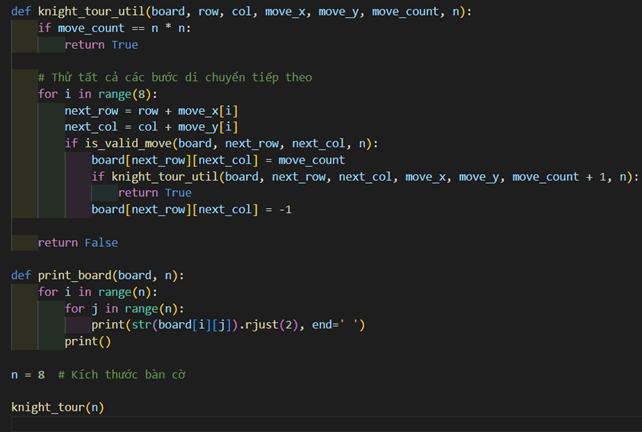 Vận dụng 3 trang 70 Chuyên đề Tin học 11: Bài toán “Mã đi tuần” được phát biểu như sau: cho vị trí ban đầu của quân mã trên bàn cờ vua 8×8, hãy tìm một hành trình của quân mã sao cho nó đi hết các ô bàn cờ mà không đi qua bất kì ô nào hai lần. Hãy dùng chiến lược quay lui để tìm lời giải cho bài toán này