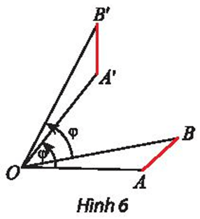 Khám phá 2 trang 27 Chuyên đề Toán 11: Cho phép quay Q(O; φ) và hai điểm tùy ý A, B (O, A, B không thẳng hàng) như Hình 6. Vẽ A’, B’ là ảnh của A, B qua phép quay. Hai tam giác OAB và OA’B’ có bằng nhau không?