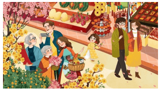 Trên đường phố, các cửa hiệu cũng thay áo mới. Với những tấm biển có màu sắc rực rỡ, những bóng đèn nhấp nháy. Đặc biệt, đi đến đâu, bé cũng được thấy những cành đào, cành mai rung rinh trong gió xuân.