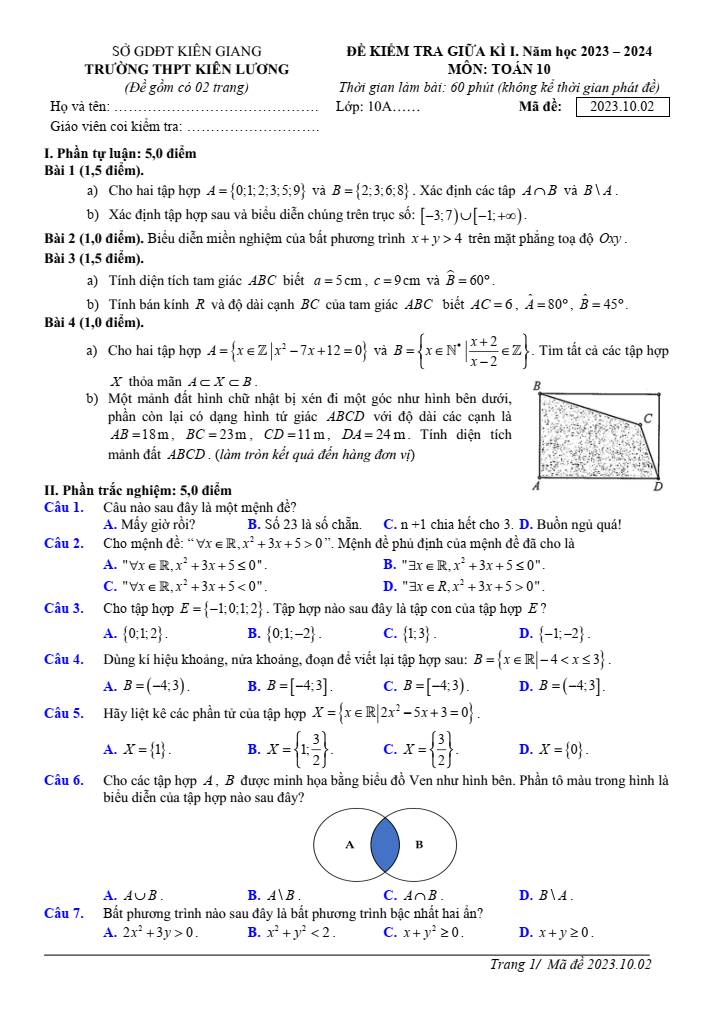 Đề thi Giữa kì 1 Toán 10 năm 2023-2024 trường THPT Kiên Lương (Kiên Giang)