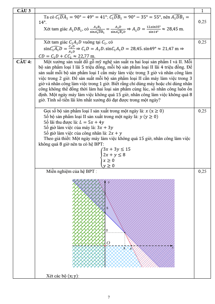 Câu 4(0,5 điểm): Một xưởng sản xuất đồ gỗ mỹ nghệ sản suất ra hai loại sản phẩm I và II. Mỗi bộ sản phẩm loại I lãi 5 triệu đồng, mỗi bộ sản phẩm loại II lãi 4 triệu đồng. Để sản suất mỗi bộ sản phẩm loại I cần máy làm việc trong 3 giờ và nhân công làm việc trong 2 giờ. Để sản suất mỗi bộ sản phẩm loại II cần máy làm việc trong 3 giờ và nhân công làm việc trong 1 giờ. Biết rằng chỉ dùng máy hoặc chỉ dùng nhân công không thể đồng thời làm hai loại sản phẩm cùng lúc, số nhân công luôn ổn định. Một ngày máy làm việc không quá 15 giờ, nhân công làm việc không quá 8 giờ. Tính số tiền lãi lớn nhất xưởng đó đạt được trong một ngày?