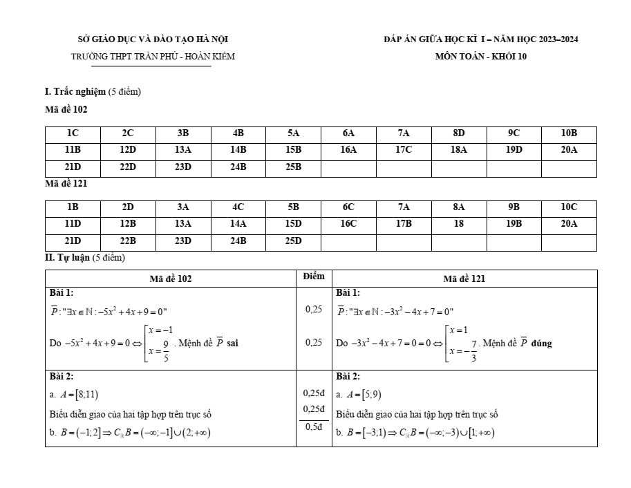 Đáp án Đề thi Giữa kì 1 trường THPT Trần Phú (Hà Nội)