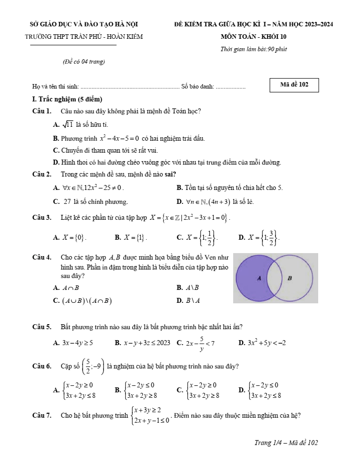 Đề thi Giữa kì 1 Toán 10 năm 2023-2024 trường THPT Trần Phú (Hà Nội)