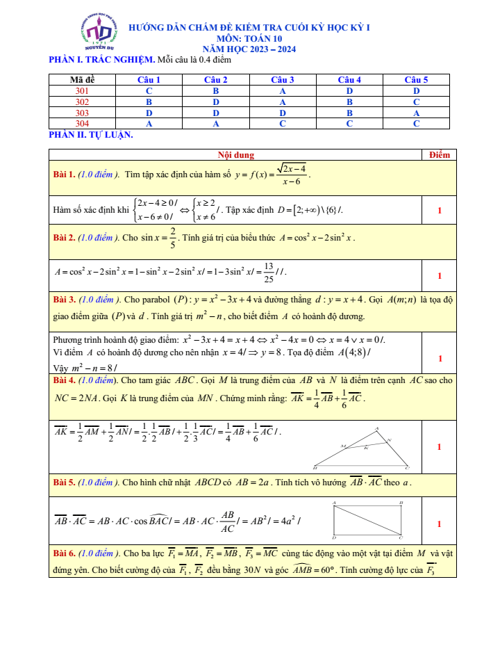Với đề thi Học kì 1 Toán 10 năm 2023-2024 trường THPT Nguyễn Du (Tp.HCM) có đáp án sẽ giúp bạn ôn tập và đạt điểm cao trong bài thi Toán 10.