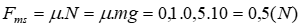 + Độ lớn lực ma sát: Fms = μ.N = 0,2.50 = 10N (0,5 điểm)