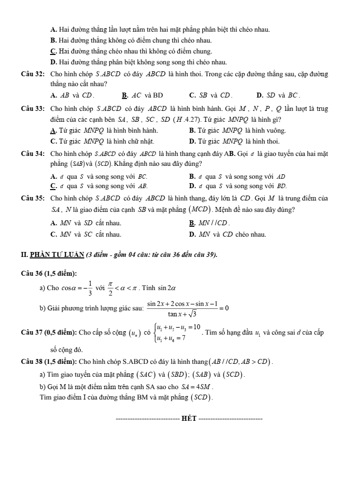 Xem thêm đề thi Giữa kì 1 Toán 11 năm 2023-2024 Lào Cai hay khác: