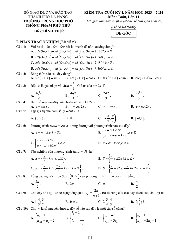 Với đề thi Học kì 1 Toán 11 năm 2023-2024 trường THPT Phạm Phú Thứ (Đà Nẵng) có đáp án sẽ giúp bạn ôn tập và đạt điểm cao trong bài thi Toán 11.
