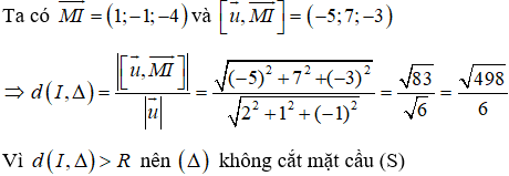 Câu 6. Cho đường thẳng và và mặt cầu (S): x2 + y2 + z2 - 2x + 4z + 1 = 0. Số điểm chung của (Δ) và (S) là :
