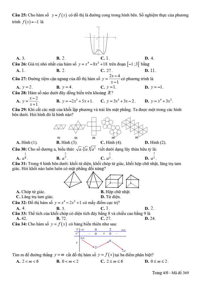 Câu 4: Đồ thị hàm số nào dưới đây có dạng như đường cong trong hình sau: