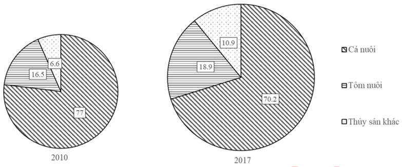 Theo biểu đồ, nhận xét nào sau đây đúng về sự thay đổi tỉ trọng cơ cấu sản lượng thủy sản nuôi trồng của nước ta năm 2017 so với năm 2010?