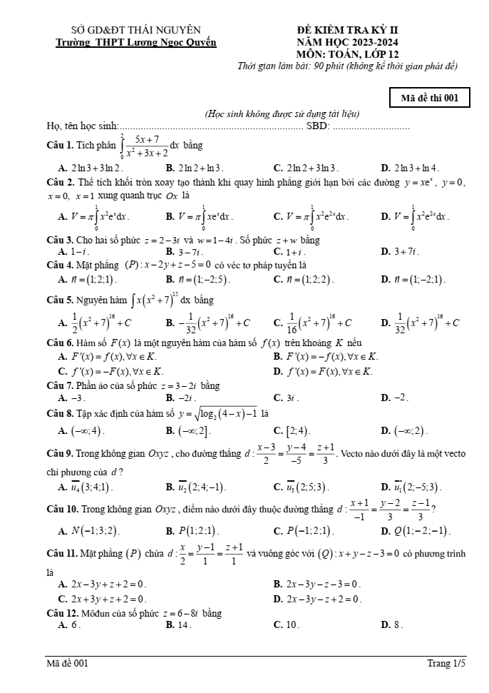 Với đề thi Học kì 2 Toán 12 năm 2023-2024 trường THPT Lương Ngọc Quyến (Thái Nguyên) có đáp án sẽ giúp bạn ôn tập và đạt điểm cao trong bài thi Toán 12.