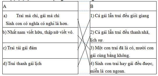 Câu 5. Nối thành ngữ, tục ngữ ở cột A với nghĩa thích hợp ở cột B. Khoanh tròn kí hiệu (a, b, c, d) trước câu tục ngữ mà em không tán thành.