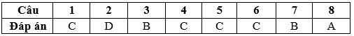 Chọn phương án trả lời đúng và ghi vào bài làm chữ cái đứng trước phương án đó cho các câu từ 1 đến 8.