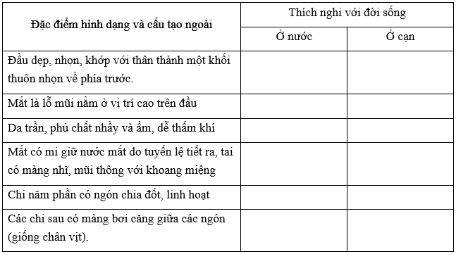 Bảng. Các đặc điểm thích nghi với đời sống của ếch