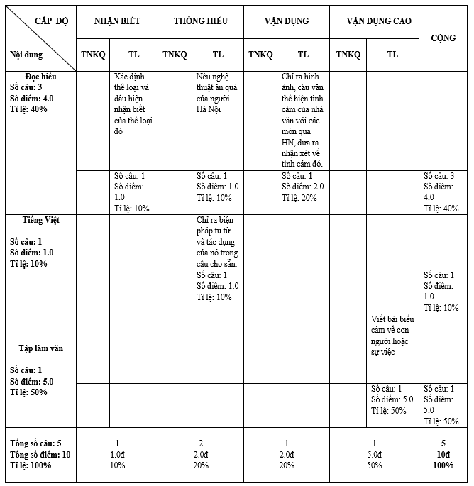 Kết bài: - Biểu cảm về đối tượng đó đối với bản thân em. * Biểu điểm chung: - Điểm 5: Xác định được ngôi viết phù hợp, đảm bảo đúng yêu cầu của bài vănbiểu cảm, đảm bảo bố cục đủ 3 phần; Có nhiều cách diễn đạt độc đáo và sáng tạo, mạch lạc, liên kết, mắc một số lỗi chính tả, dùng từ. - Điểm 3,4: Xác định được ngôi viết phù hợp, đảm bảo đúng yêu cầu của bài vănbiểu cảm, đảm bảo bố cục đủ 3 phần; Có mạch lạc, liên kết, mắc nhiều lỗi chính tả, dùng từ, đặt câu. - Điểm 2: Bố cục không rõ ràng, đảm bảo đúng yêu cầu bài văn biểu cảm, mắc nhiều lỗi chính tả, dùng từ, đặt câu. - Điểm 1: Các trường hợp còn lại. |