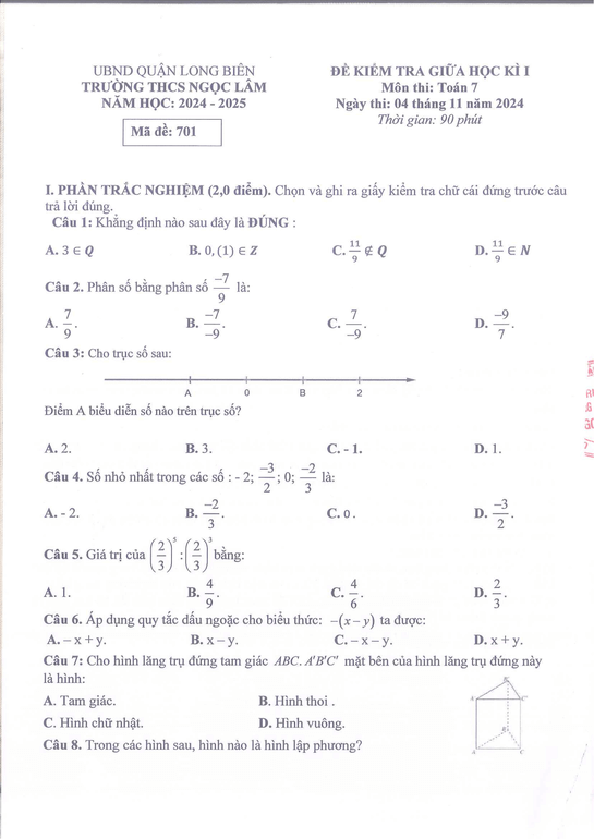 Đáp án Đề thi Giữa kì 1 Trường THCS Ngọc Lâm - Hà Nội (đề 701)