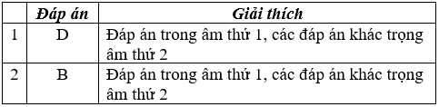 Giải thích: Đáp án D trọng âm thứ 2, các đáp án còn lại trọng âm thứ 1