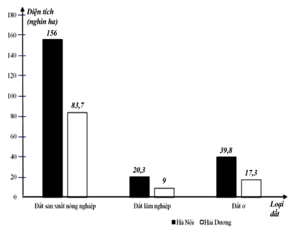 Bài 1 (2,5đ): Cho biểu đồ sau biểu diễn hiện trạng sử dụng đất ở Hà Nội và Hải Dương tính đến ngày 31 tháng 12 năm 2020 đối với đất sản xuất nông nghiệp, đất lâm nghiệp, đất ở.