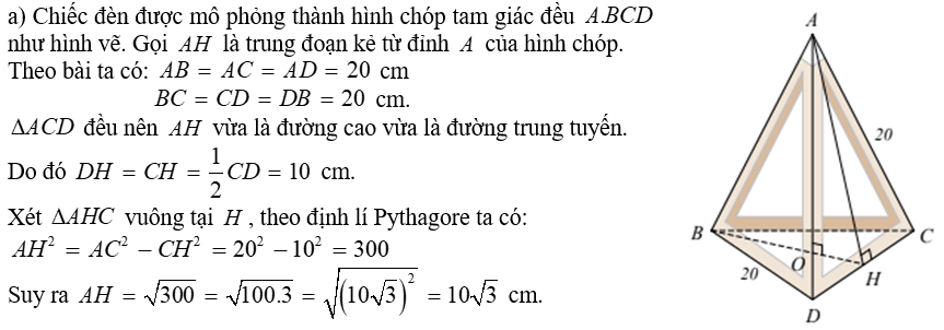 2. Bạn Nam đo một chiếc đèn thả trang trí như hình vẽ bên thì nhận thấy các cạnh đều có cùng độ dài là 20 cm. a) Tính độ dài trung đoạn của hình chóp. b) Tính diện tích xung quanh của chiếc đèn. c) Bạn Nam đọc và thấy rằng khi treo đèn thì khoảng cách từ đáy của đèn cách mặt trền là 1 m là tốt nhất. Vậy bạn Nam cần đưa đoạn dây điện từ đầu đèn (vị trí A) tới mặt trần là bao nhiêu (làm tròn kết quả đến hàng phần mười)? |