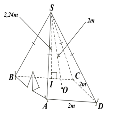 Bài 4. (1,0 điểm) Một chiếc lều ở một trại hè của học sinh tham gia cắm trại có dạng hình chóp tứ giác đều theo các kích thước như hình vẽ bên. a) Thể tích không khí bên trong lều là bao nhiêu (làm tròn kết quả đến chữ số thập phân thứ hai)? b) Xác định số vải bạt cần thiết để dựng lều (không tính đến đường viền, nếp gấp, ...) là bao nhiêu (làm tròn kết quả đến chữ số thập phân thứ hai)? Biết độ dài trung đoạn của lều trại là 2,24 cm. |