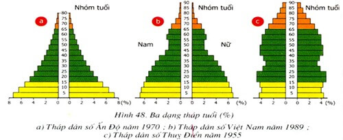 Câu 20: Quần thể người có 3 dạng tháp tuổi như hình sau