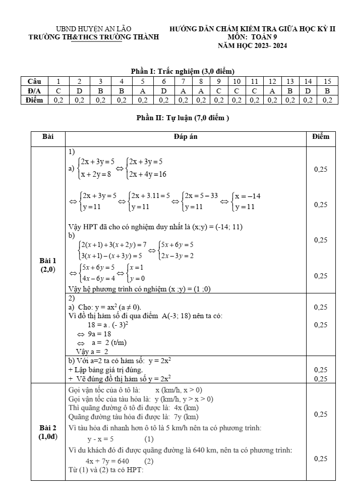 Với đề thi Giữa kì 2 Toán 9 năm 2023-2024 trường TH&THCS Trường Thành (Hải Phòng) có đáp án sẽ giúp bạn ôn tập và đạt điểm cao trong bài thi Toán 9.
