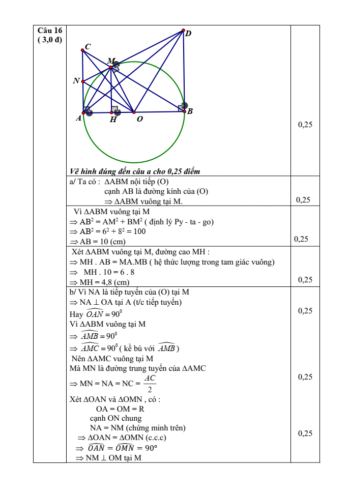 b) Tiếp tuyến tại A của đường tròn (O) cắt tia BM ở C. Gọi N là trung điểm của AC. Chứng minh đường thẳng NM là tiếp tuyến của đường tròn (O).