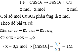 Câu 11. Ngâm một đinh sắt trong 200ml dung dịch CuSO4. Sau khi phản ứng kết thúc lấy đinh sắt ra khỏi dung dịch rửa nhẹ, làm khô thấy khối lượng đinh sắt tăng thêm 1,6 gam. Nồng độ ban đầu của CuSO4 là bao nhiêu mol/l?