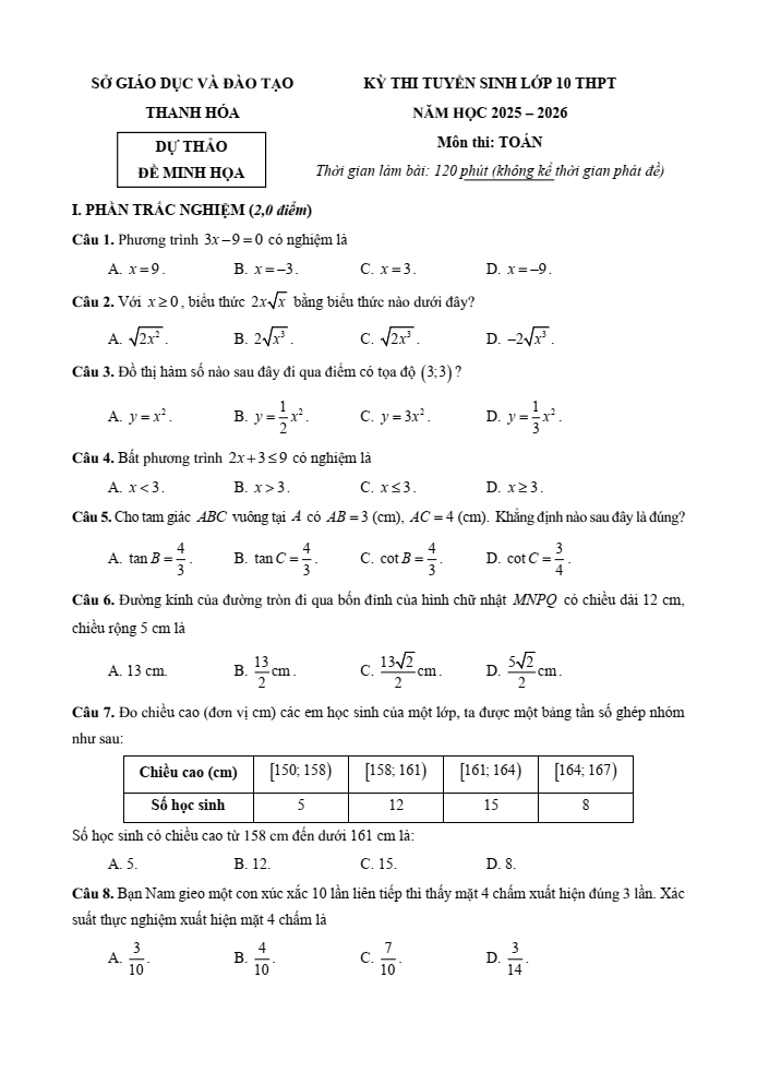 Đề minh họa Toán vào lớp 10 năm 2025 Sở GD&ĐT Thanh Hóa