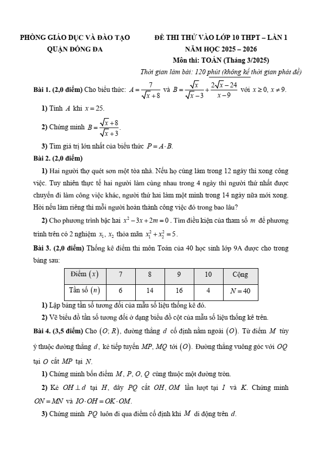 Bài viết cập nhật Đề thi thử Toán vào lớp 10 năm 2025 Phòng GD&ĐT Đống Đa giúp học sinh làm quen với các ra đề từ đó có thêm tài liệu ôn thi vào lớp 10 môn Toán.
