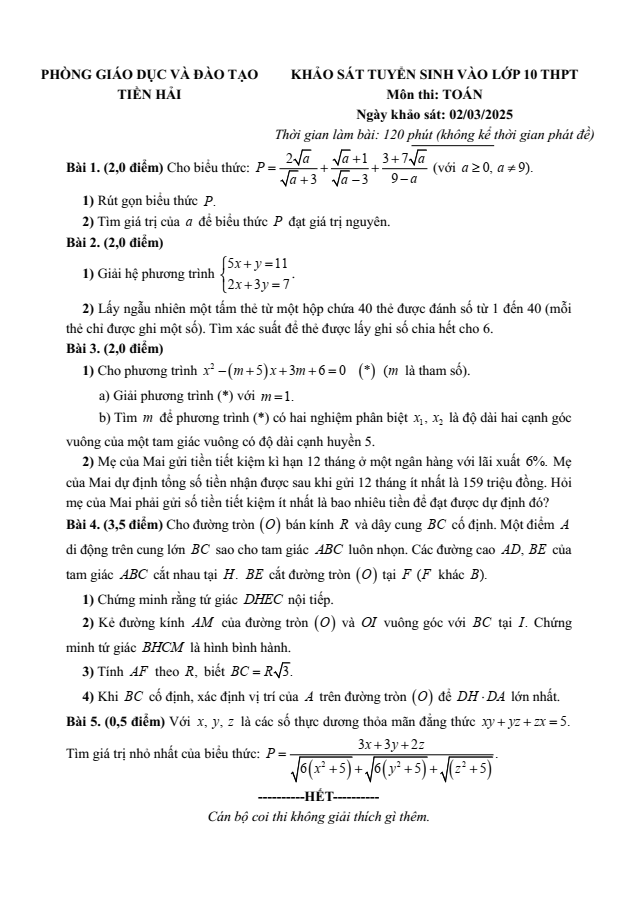 Đề thi thử Toán vào lớp 10 năm 2025 Phòng GD&ĐT Tiền Hải