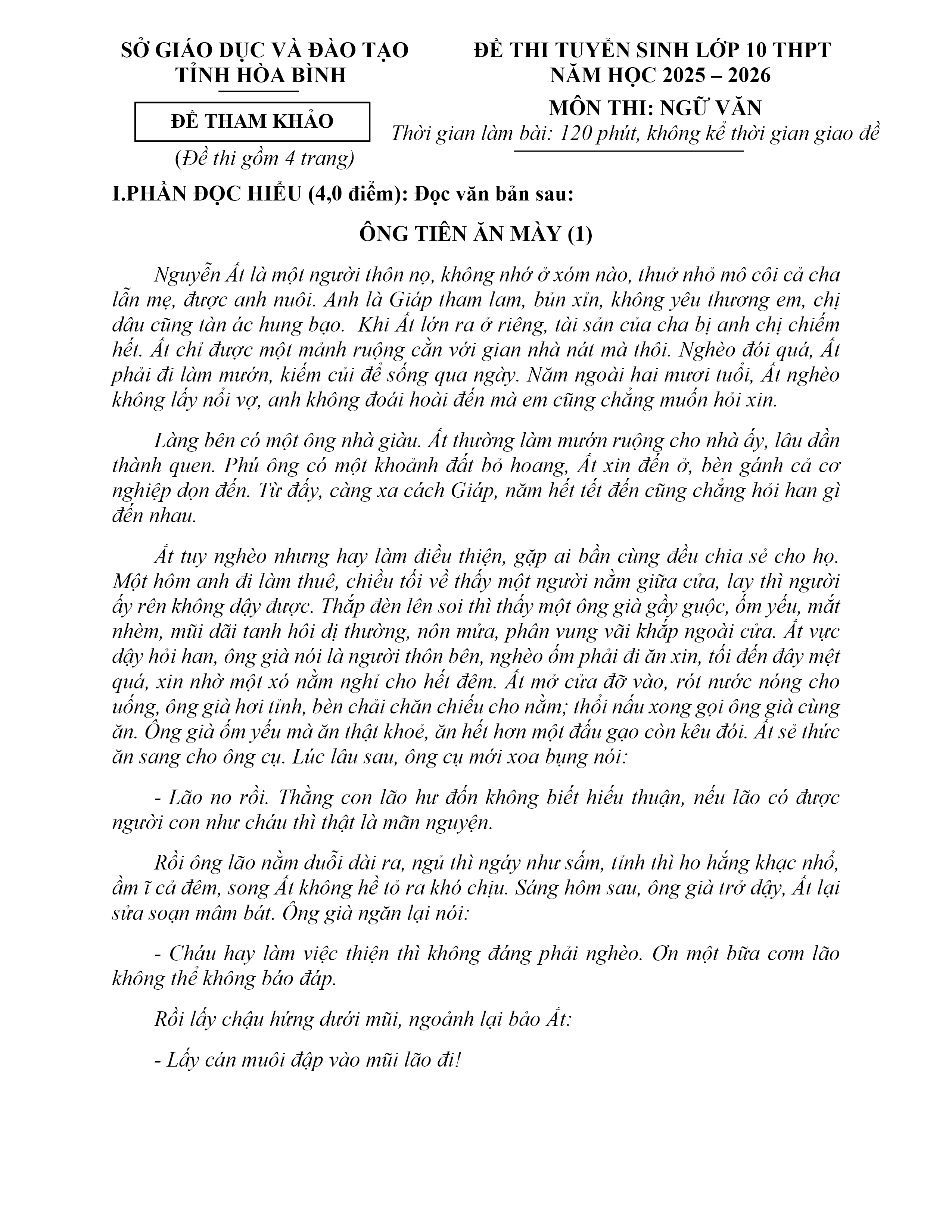 Đề minh họa Văn vào lớp 10 năm 2025 Sở GD&ĐT Hòa Bình
